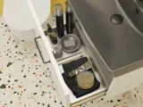 Ovien takana on hyllytilaa pyyhkeille ja esim. suurille pesuainepulloille. Korkeat allaskaapit ja täysin ulosvedettävä laatikot tarjoavat hyvää säilytystilaa, ja takimmatkin tavarat ovat aina helposti käden ulottuvilla. Laatikoissa ja kaapeissa on pehmeästi sulkeutuva soft close -mekanismi ja niitä voidaan säätää tarpeen mukaan.